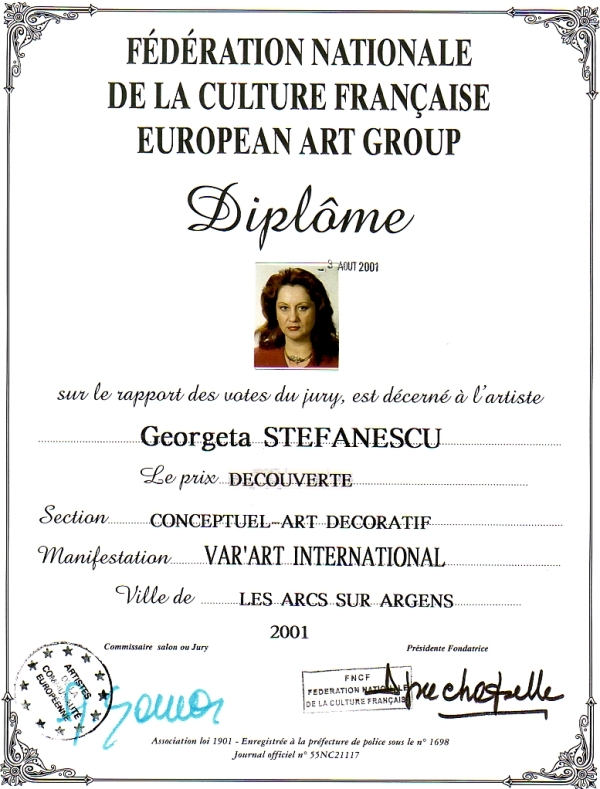 2001 - Médaille d'OR des Arts , Salon VART'ART INTERNATIONAL , FNCF-EAG , Arcs sur Argens , FR