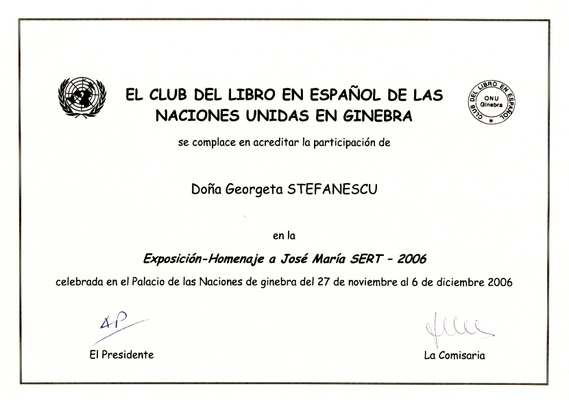 2006 - Diplôme , Expo. Homenajes Jose Maria Sert , Club del Libro en Espanol , ONU , Genève , CH