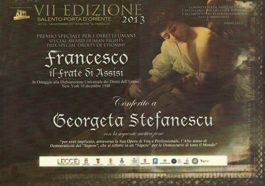 2013 - Prix Spécial Droits de l'Homme FRANCESCO il frate di ASSISI 2013 , SALENTO PORTA d'ORIENTE ,
