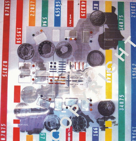 EURO - FUTUR 2002 , 194 x 200 x 10 cm , plastique , papier , poignés , couleurs céramique